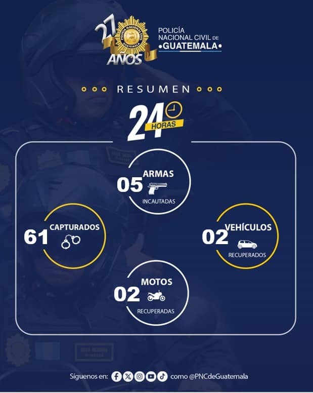 61 capturados, 5 armas incautadas, la recuperación de 2 vehículos y 2 motocicletas De las 61 personas capturadas ayer, 12 fueron en la capital y 49 en los departamentos; 17…